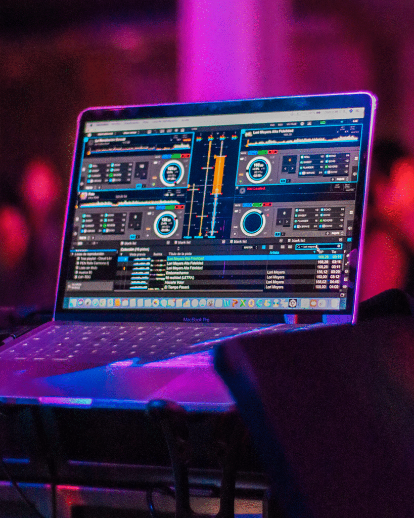 Los efectos visuales corren a cargo de iluminación LED y láser profesional, máquinas de humo y confeti que generan atmósfera sin resultar invasivos. La microfonía profesional permite animación clara y entretenimiento en vivo sin distorsiones, todo procesado desde MacBook Pro para garantizar estabilidad técnica.